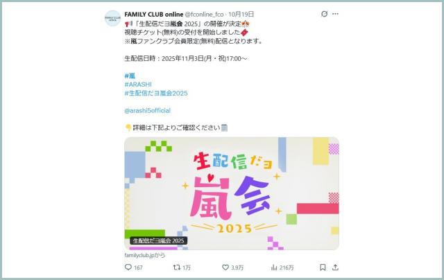 嵐5人集合「生配信だヨ嵐会 2025」11月3日開催!活休前2020年配…