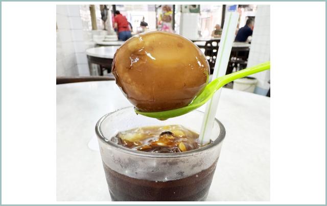 玉子入りアイスティーの卵を食べながらアイスティーを飲む / 名…
