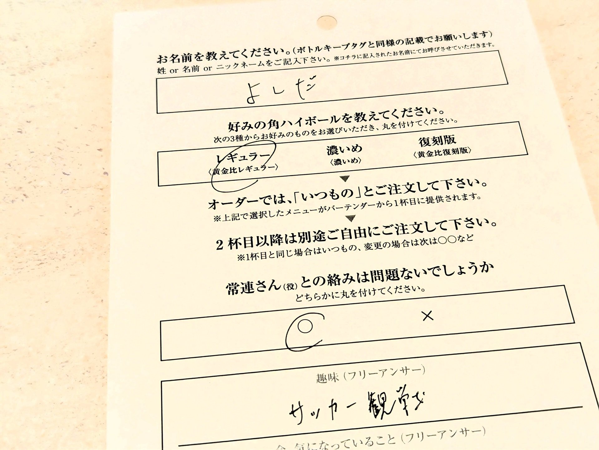 このバーの最大の魅力は、常連さん気分が味わえる「いつもので」体験。事前のアンケートを元に、バーテンダーがお客の好みに合わせた1杯目を提供してくれる仕掛けになっています。