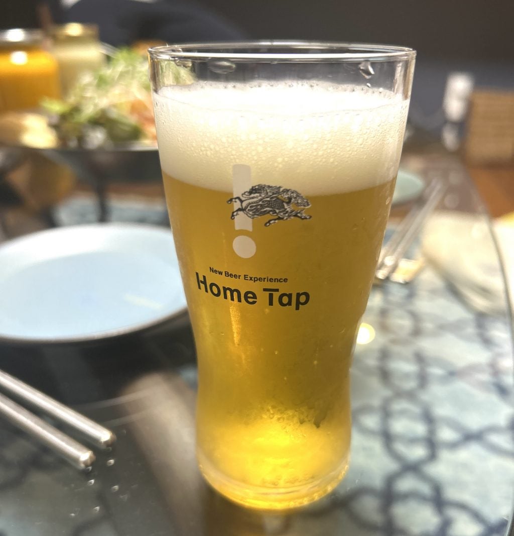 1杯目のビールは、『銀河⾼原ビール』。⼩⻨と酵⺟による、まろやかな⼝当たりとフルーティで奥深い⾹りが特徴。